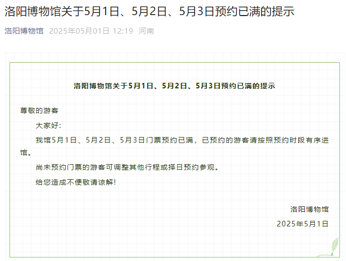 洛阳博物馆:5月1日、5月2日、5月3日门票预约已满