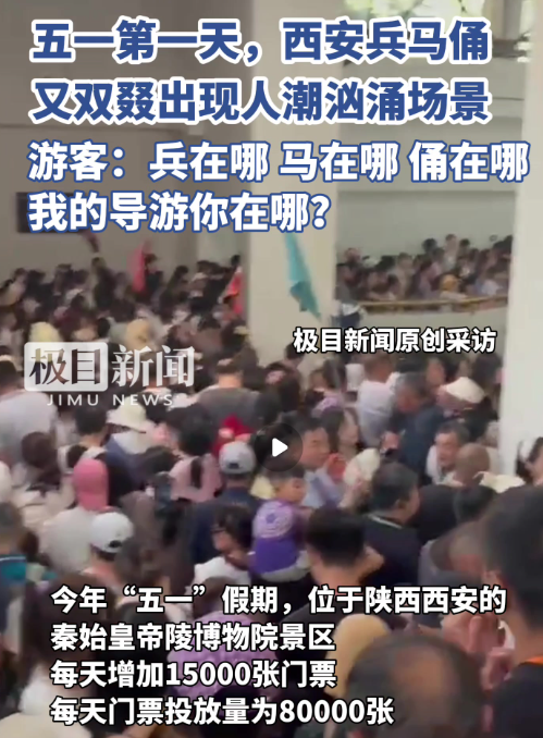 兵在哪儿?马在哪儿?俑在哪儿?导游你在哪儿?五一假期第一天,西安兵马俑景区出现人潮汹涌的场景。有网友发布视频称,西安兵马俑景区,人比兵马俑都要多,“兵马俑快没地方站了”!