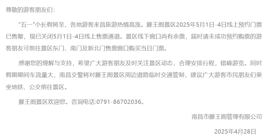 滕王阁景区:5月1日—5月4日线上预约门票已售罄